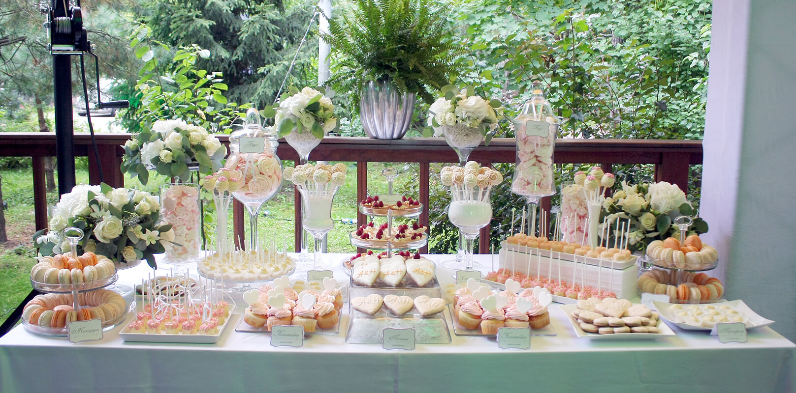 Это стилизованный сладкий стол десертов и сладостей, на котором расположены разнообразные мини-пирожные, леденцы, мармелад, капкейки, кейк-попсы, воздушное суфле, трайфлы в стаканчиках и другие десерты. Смысл понятен: гость подходит к стойке и угощается понравившимся десертом.